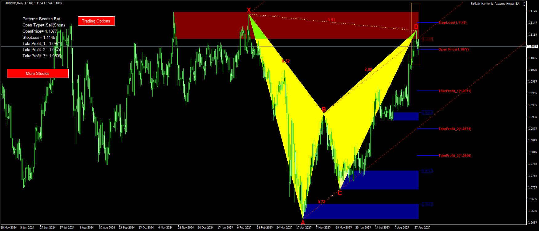 @AUDNZD(D1)-Pattern: Bat : SellStop@: 1.1077, StopLoss: 1.1145, TakeProfit_1: 1.0971, TakeProfit_2: 1.0874, TakeProfit_3: 1.0806
