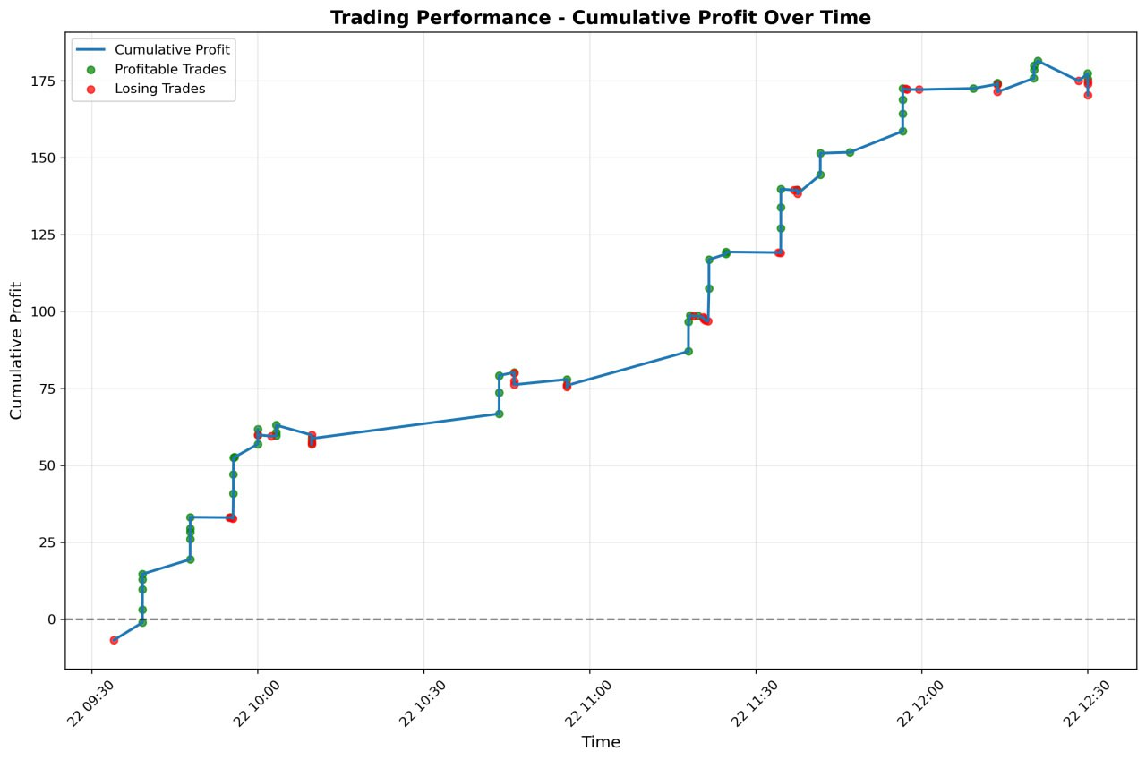 - Fascinating Asymmetry in Sells vs. Buys: The strategy showed a phenomenal 78.9% win rate on sell trades during this session, compared to a modest 51.9% on buys. This suggests the underlying price action logic was exceptionally tuned to the bearish momentum present in the market today.