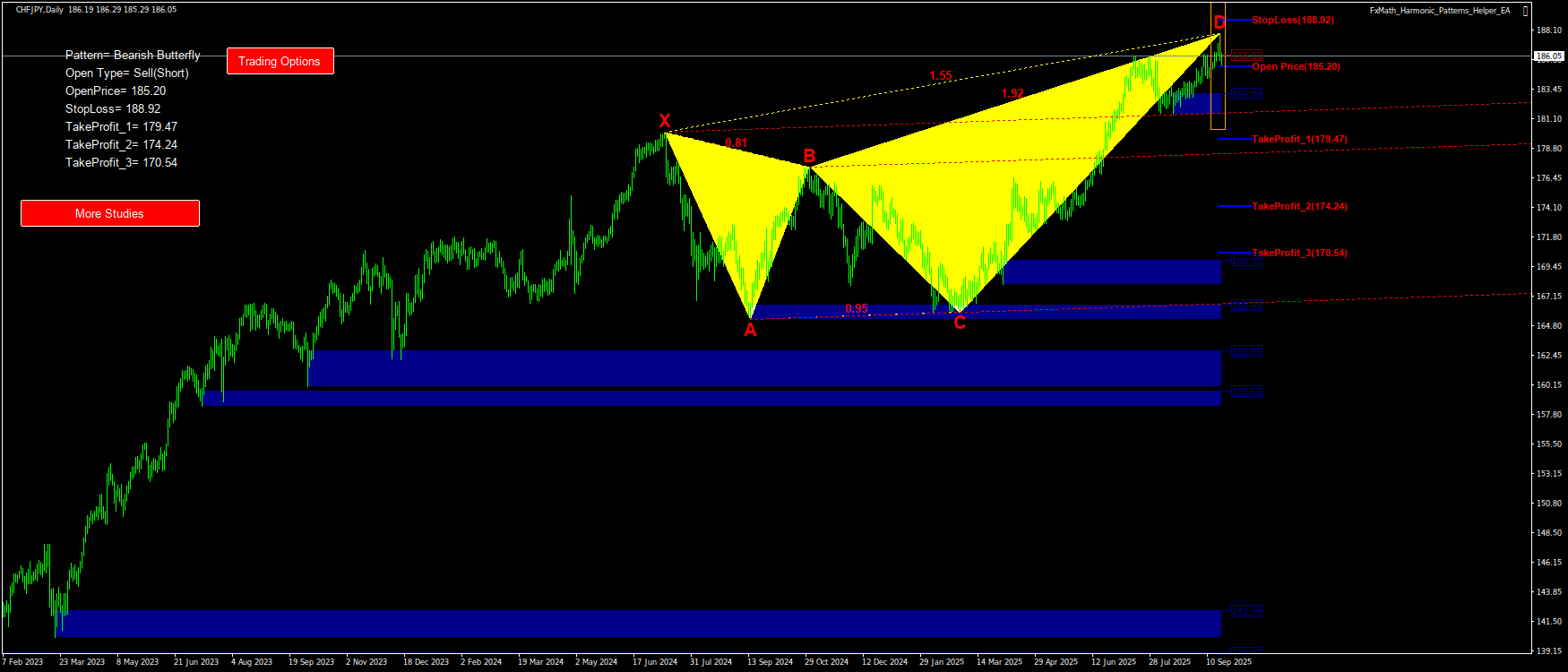 @CHFJPY(D1)-Pattern: Butterfly : SellStop@: 185.20, StopLoss: 188.92, TakeProfit_1: 179.47, TakeProfit_2: 174.24, TakeProfit_3: 170.54