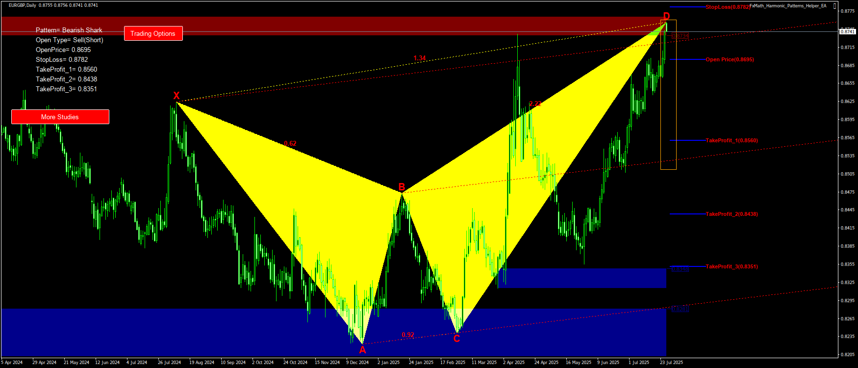 @EURGBP(D1)-Pattern: Shark : SellStop@: 0.8695, StopLoss: 0.8782, TakeProfit_1: 0.8560, TakeProfit_2: 0.8438, TakeProfit_3: 0.8351