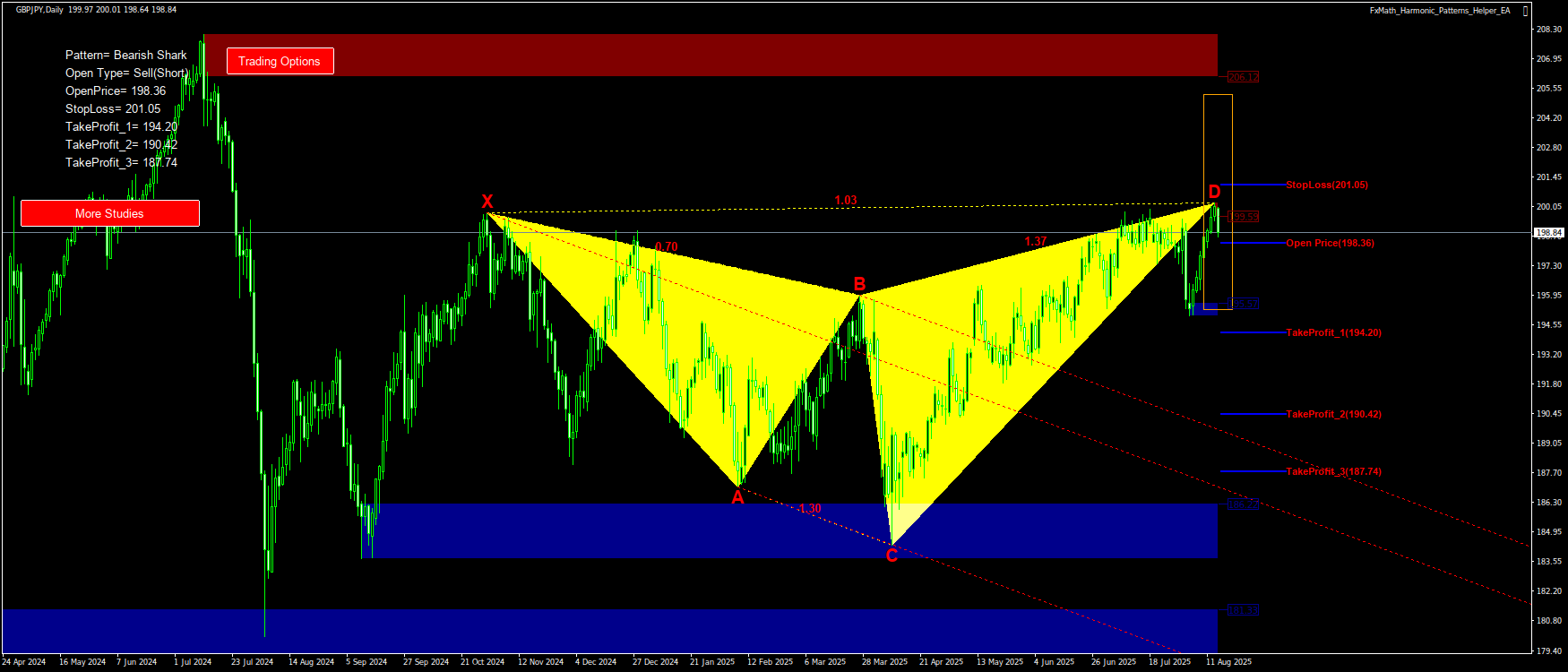 @GBPJPY(D1)-Pattern: Shark : SellStop@: 198.36, StopLoss: 201.05, TakeProfit_1: 194.20, TakeProfit_2: 190.42, TakeProfit_3: 187.74-2025.08.14 08:17