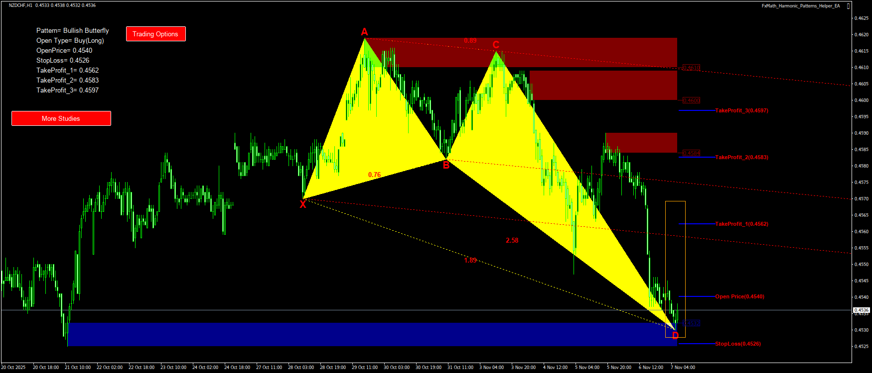 @NZDCHF(H1)-Pattern: Butterfly : BuyStop@: 0.4540, StopLoss: 0.4526, TakeProfit_1: 0.4562, TakeProfit_2: 0.4583, TakeProfit_3: 0.4597