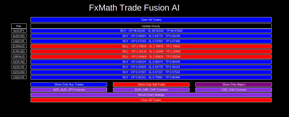 A single glance at the FxMath Trade Fusion AI dashboard reveals its core purpose. Instead of a complex chart, you see a clean, actionable list of trading signals across a wide range of currency pairs. This isn’t just a list; it’s a carefully curated basket of opportunities.