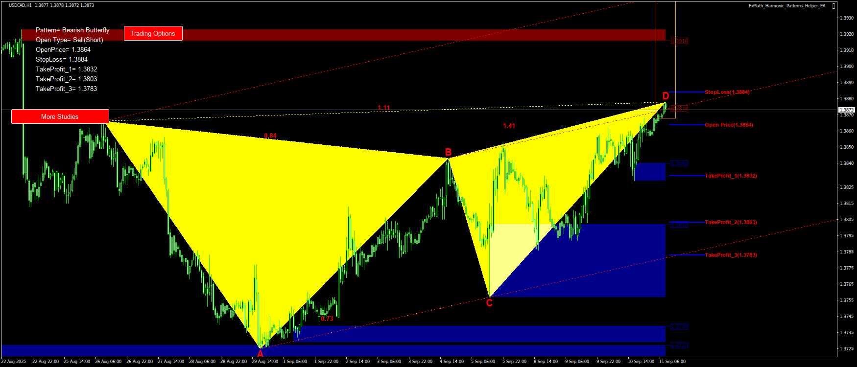 @USDCAD(H1)-Pattern: Butterfly : SellStop@: 1.3864, StopLoss: 1.3884, TakeProfit_1: 1.3832, TakeProfit_2: 1.3803, TakeProfit_3: 1.3783-2025.09.11 09:23
