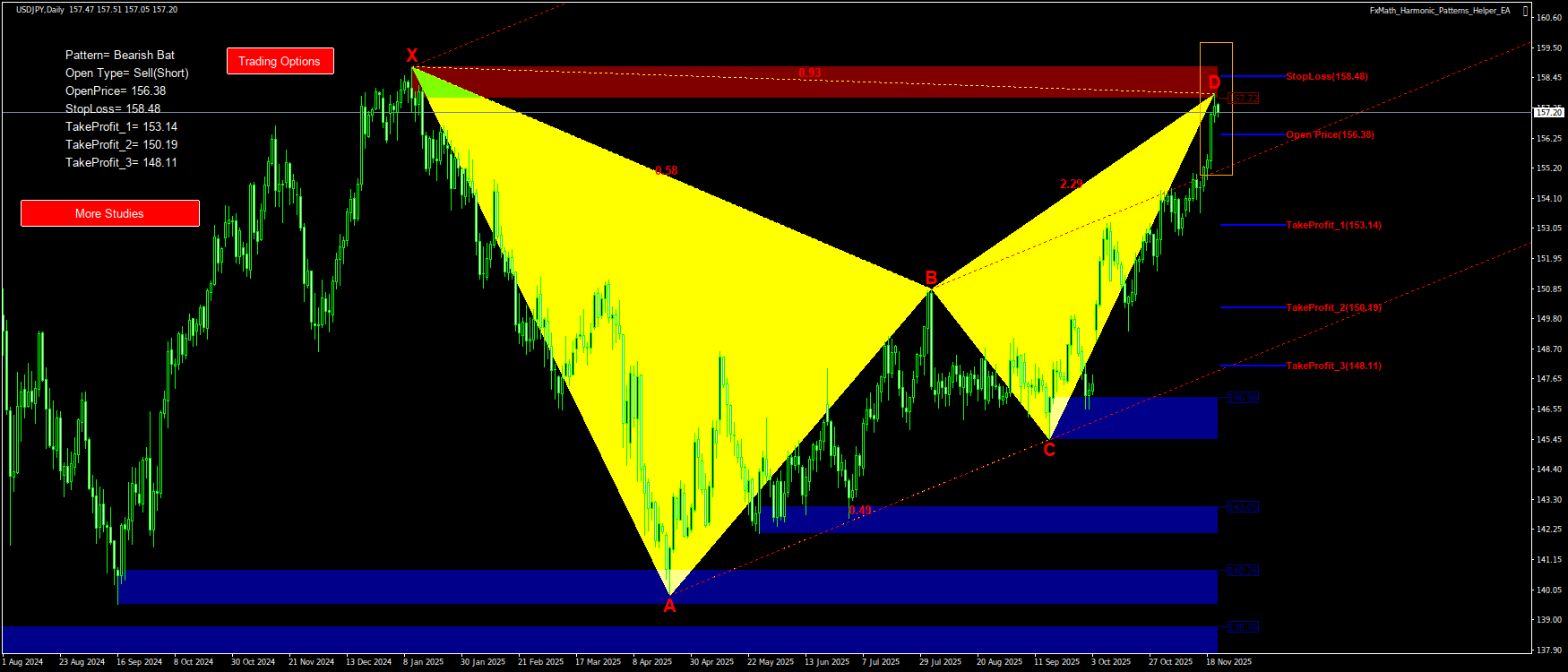 @USDJPY(D1)-Pattern: Bat : SellStop@: 156.38, StopLoss: 158.48, TakeProfit_1: 153.14, TakeProfit_2: 150.19, TakeProfit_3: 148.11-2025.11.21 07:54