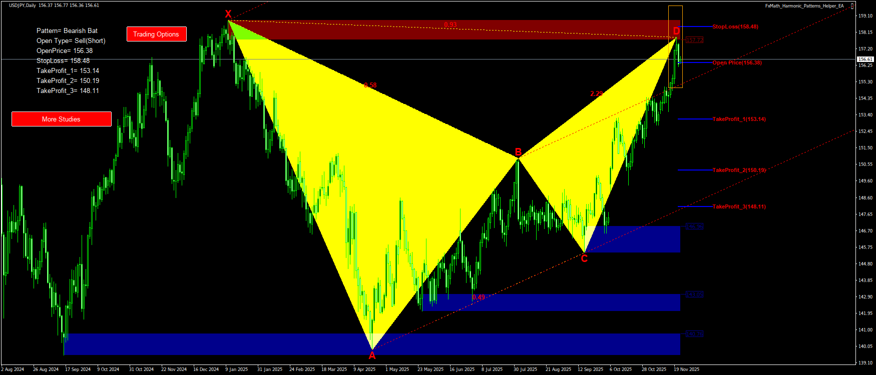@USDJPY(D1)-Pattern: Bat : SellStop@: 156.38, StopLoss: 158.48, TakeProfit_1: 153.14, TakeProfit_2: 150.19, TakeProfit_3: 148.11-2025.11.24 08:47