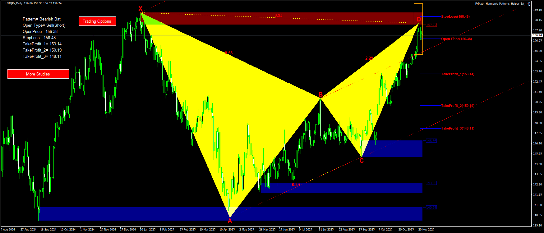 @USDJPY(D1)-Pattern: Bat : SellStop@: 156.38, StopLoss: 158.48, TakeProfit_1: 153.14, TakeProfit_2: 150.19, TakeProfit_3: 148.11-2025.11.25 08:01