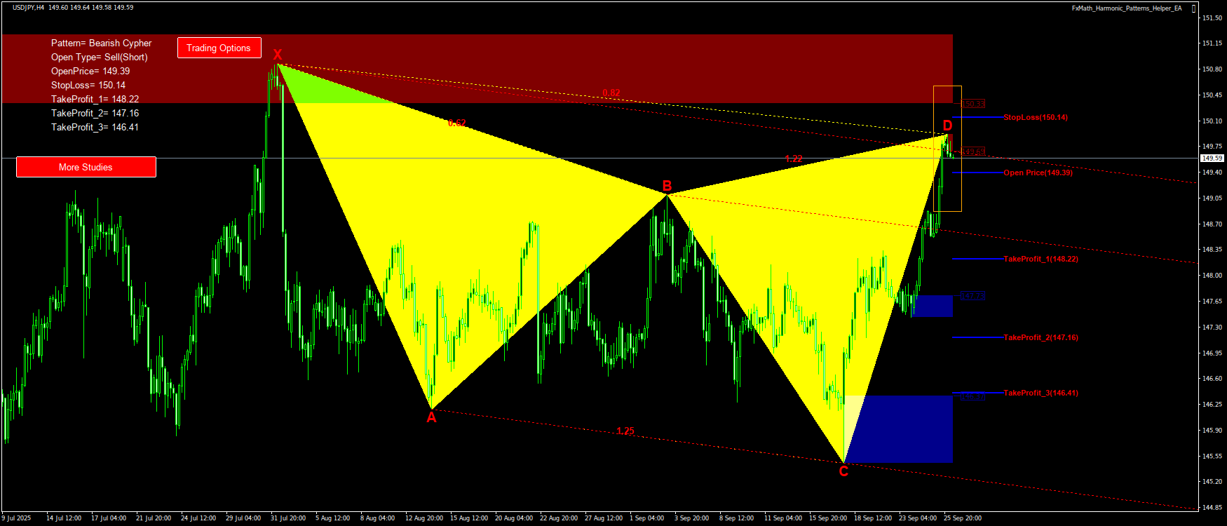 @USDJPY(H4)-Pattern: Cypher : SellStop@: 149.39, StopLoss: 150.14, TakeProfit_1: 148.22, TakeProfit_2: 147.16, TakeProfit_3: 146.41